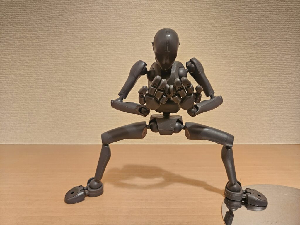 吐いて、オープン、手のひらを外へ向け、左右の壁をなぞるように上から横へ広げ、徐々に膝を曲げ(2カウント)、